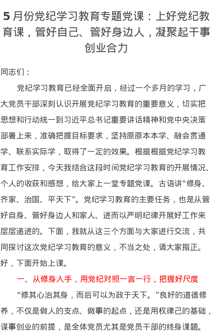 5月份党纪学习教育专题党课:上好党纪教育课,管好自己、管好身边人,凝聚起干事创业合力