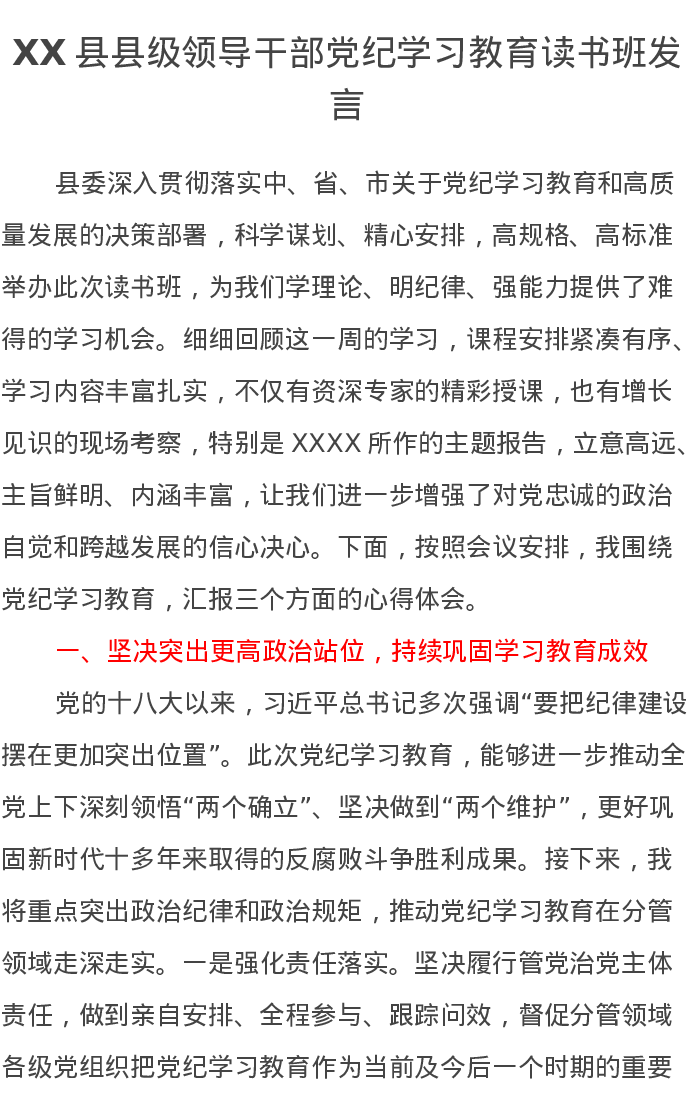 XX县县级领导干部党纪学习教育读书班发言4