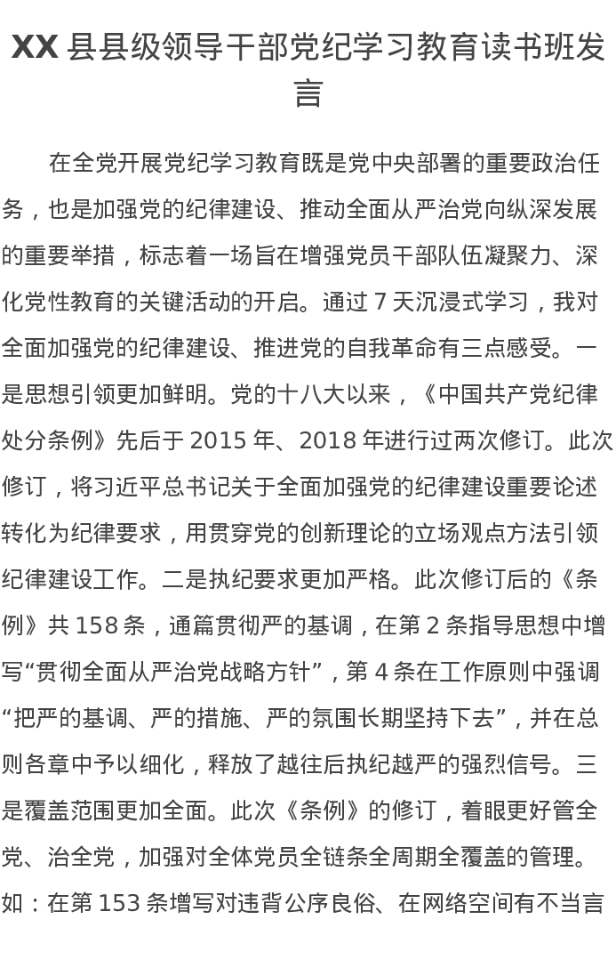 XX县县级领导干部党纪学习教育读书班发言(宣传部长)