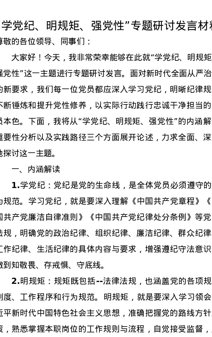 “学党纪、明规矩、强党性”专题研讨发言材料