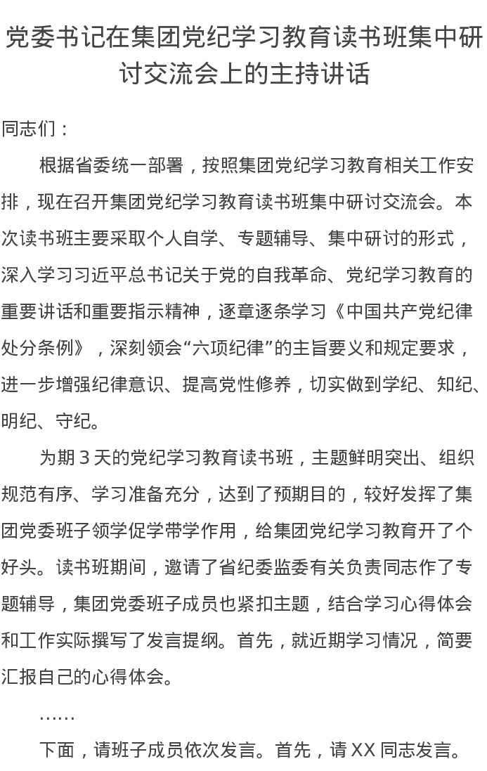 党委书记在集团党纪学习教育读书班集中研讨交流会上的主持讲话