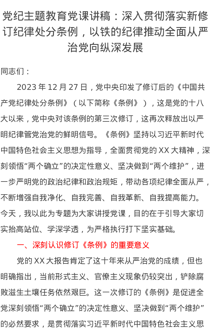 党纪主题教育党课讲稿:深入贯彻落实新修订纪律处分条例,以铁的纪律推动全面从严治党向纵深发展