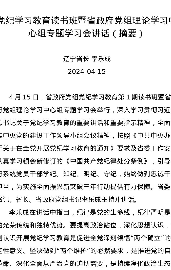 党纪学习教育∣03领导讲话:20240415党纪学习教育读书班暨省政府党组理论学习中心组专题学习会讲话(摘要)