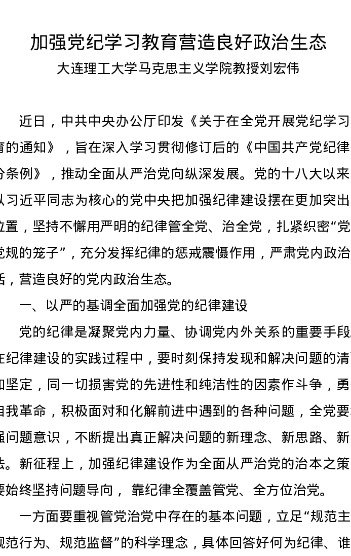 党纪学习教育∣08党课讲稿:加强党纪学习教育营造良好政治生态——大连理工大学马克思主义学院教授刘宏伟