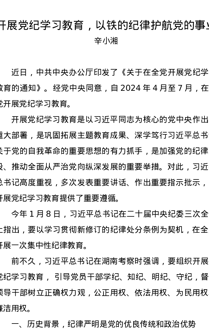党纪学习教育∣08党课讲稿:开展党纪学习教育,以铁的纪律护航党的事业——辛小湘