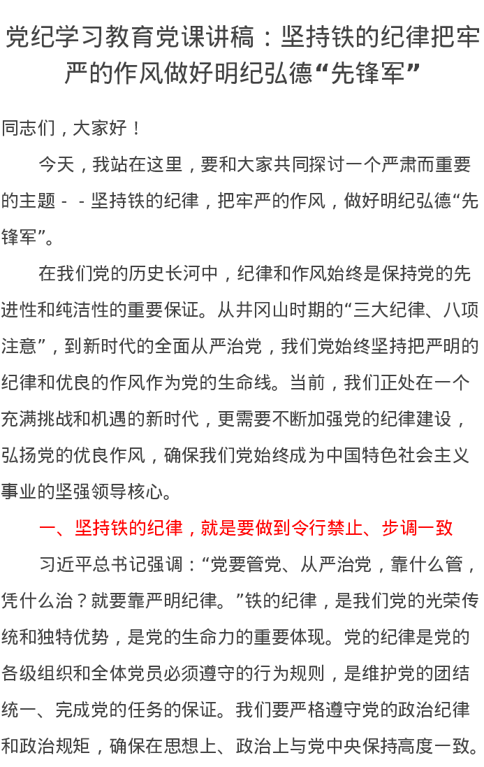 党纪学习教育党课讲稿:坚持铁的纪律把牢严的作风做好明纪弘德“先锋军”