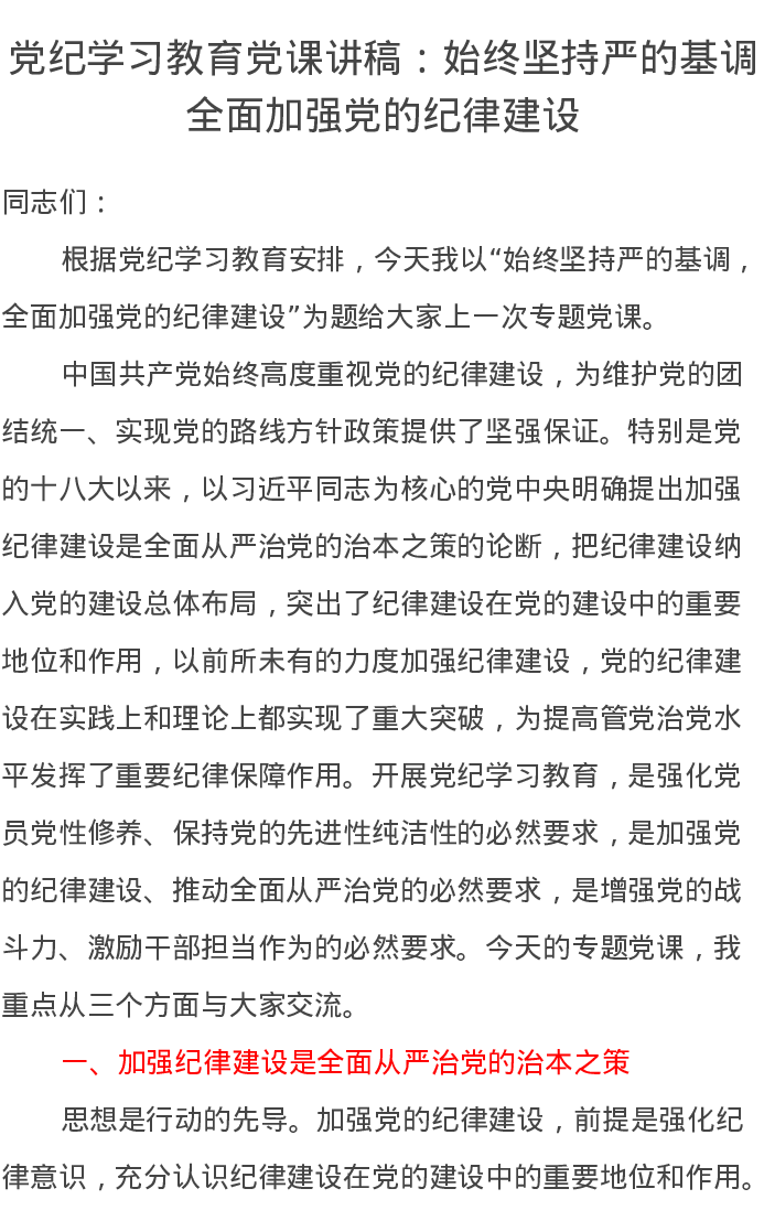 党纪学习教育党课讲稿:始终坚持严的基调,全面加强党的纪律建设