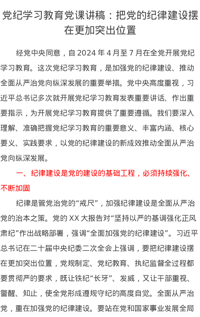 党纪学习教育党课讲稿:把党的纪律建设摆在更加突出位置