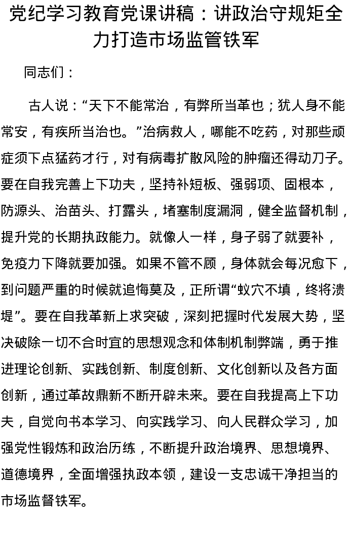 党纪学习教育党课讲稿:讲政治守规矩全力打造市场监管铁军