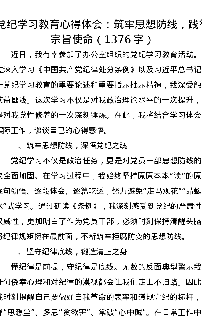 党纪学习教育心得体会:筑牢思想防线,践行宗旨使命