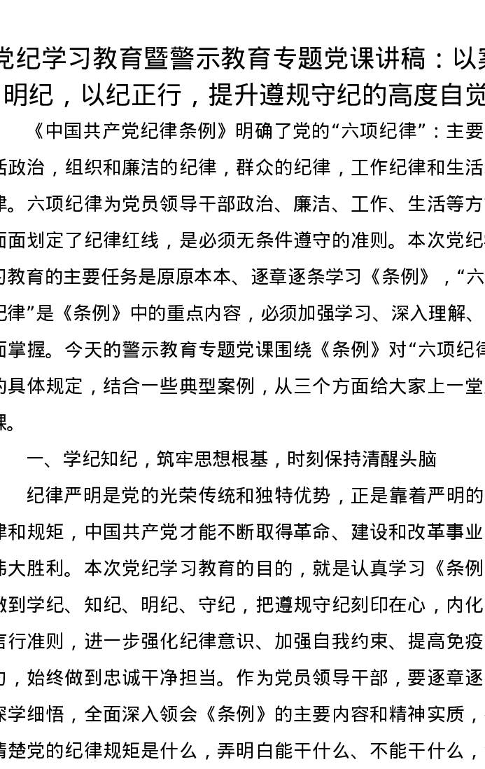 党纪学习教育暨警示教育专题党课讲稿:以案明纪,以纪正行,提升遵规守纪的高度自觉