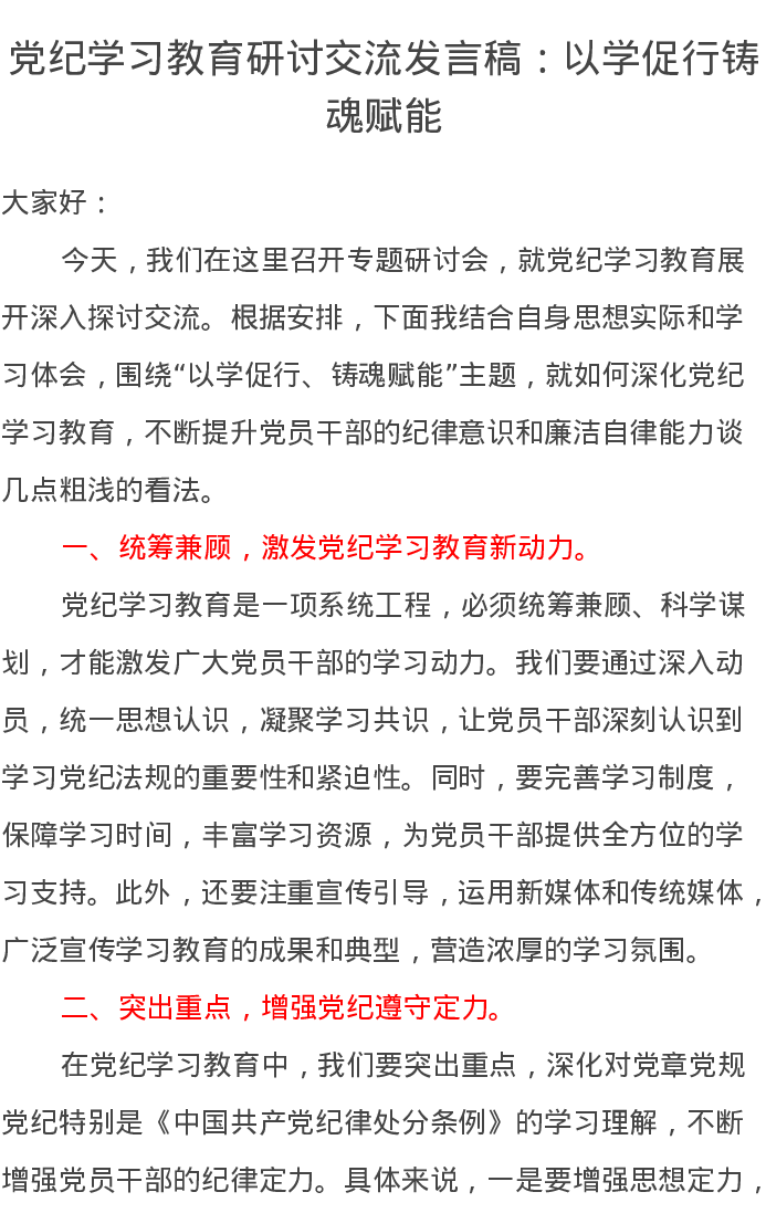 党纪学习教育研讨交流发言稿:以学促行铸魂赋能