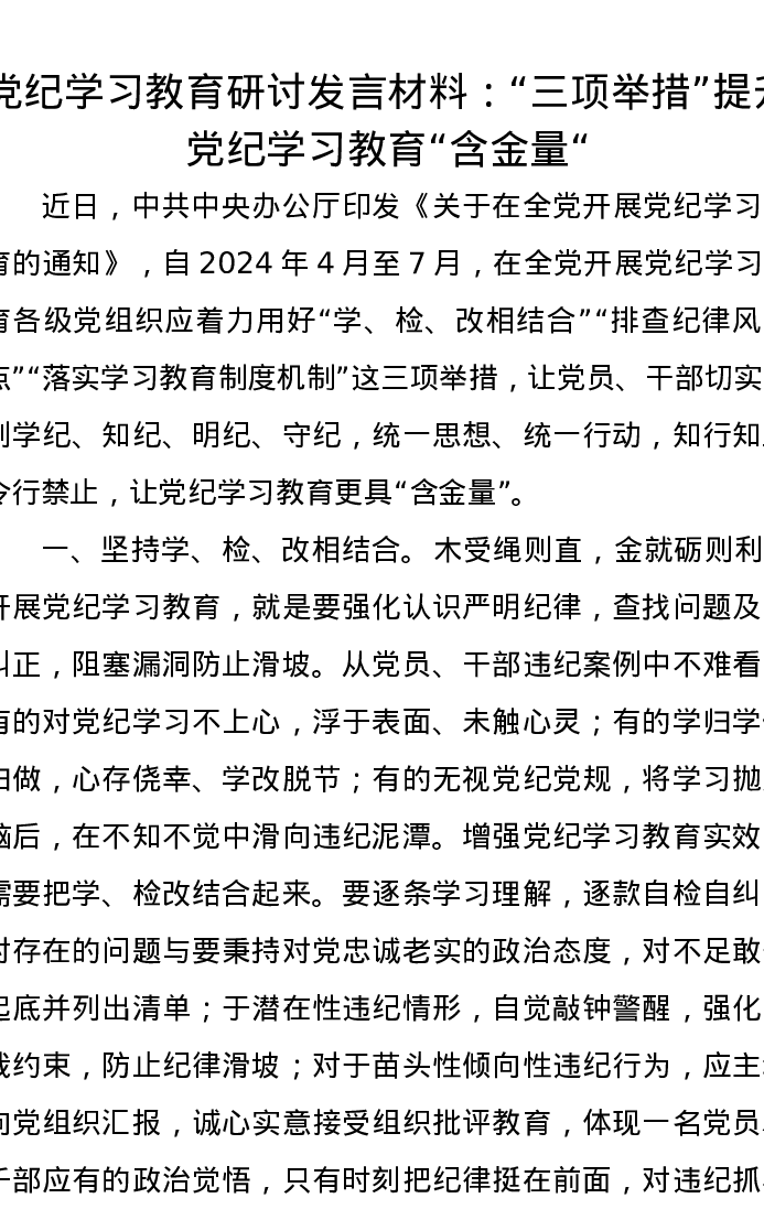 党纪学习教育研讨发言材料:“三项举措”提升党纪学习教育“含金量“