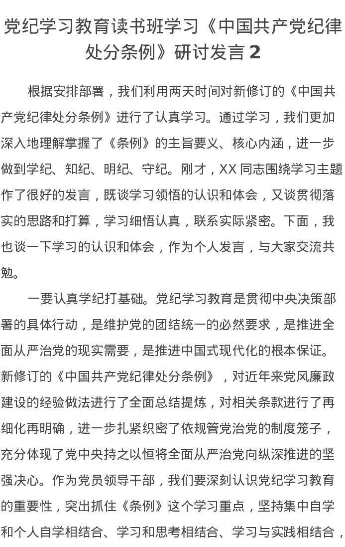 党纪学习教育读书班学习《中国共产党纪律处分条例》研讨发言2