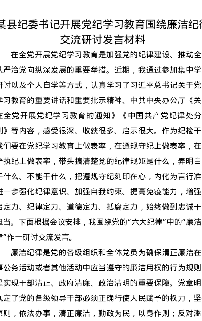 某县纪委书记开展党纪学习教育围绕廉洁纪律交流研讨发言材料