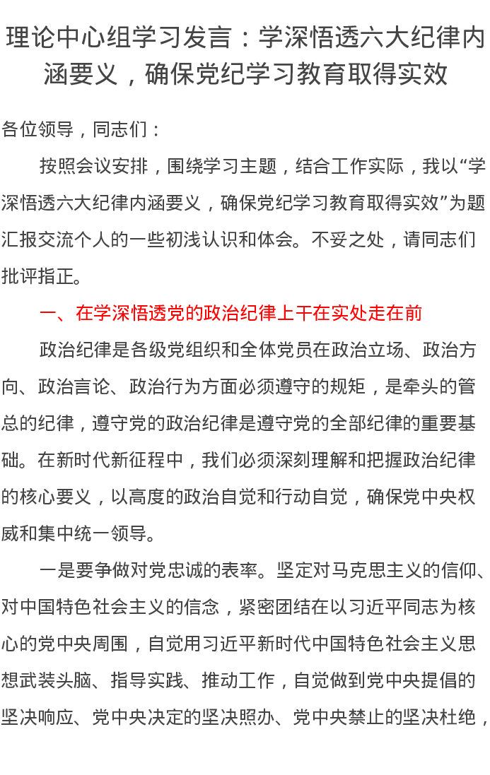 理论中心组学习发言:学深悟透六大纪律内涵要义,确保党纪学习教育取得实效