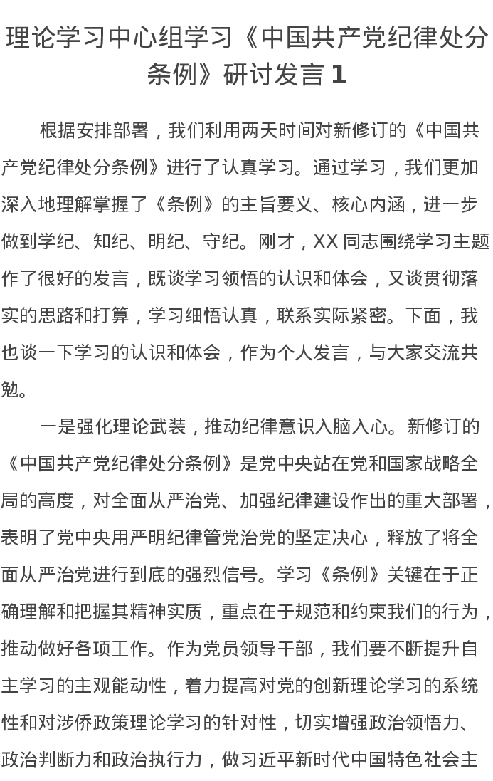 理论学习中心组学习《中国共产党纪律处分条例》研讨发言1