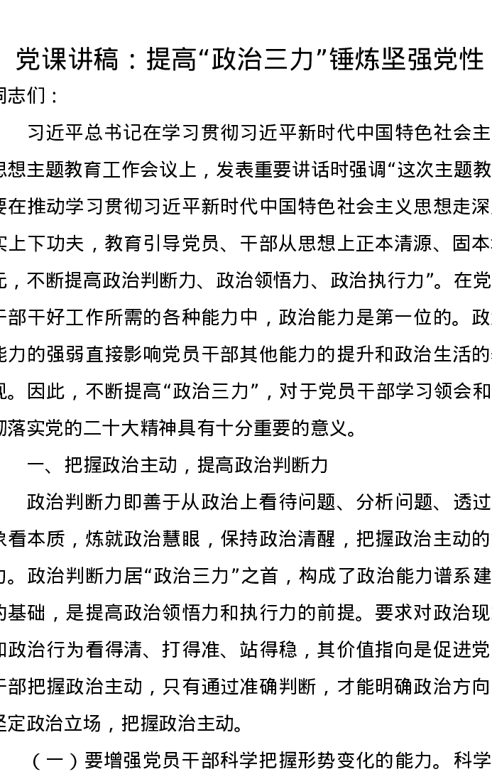 党课讲稿:提高“政治三力”锤炼坚强党性