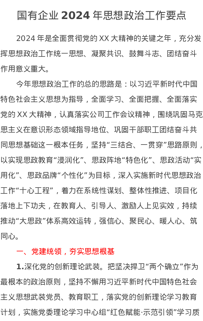 国有企业2024年思想政治工作要点