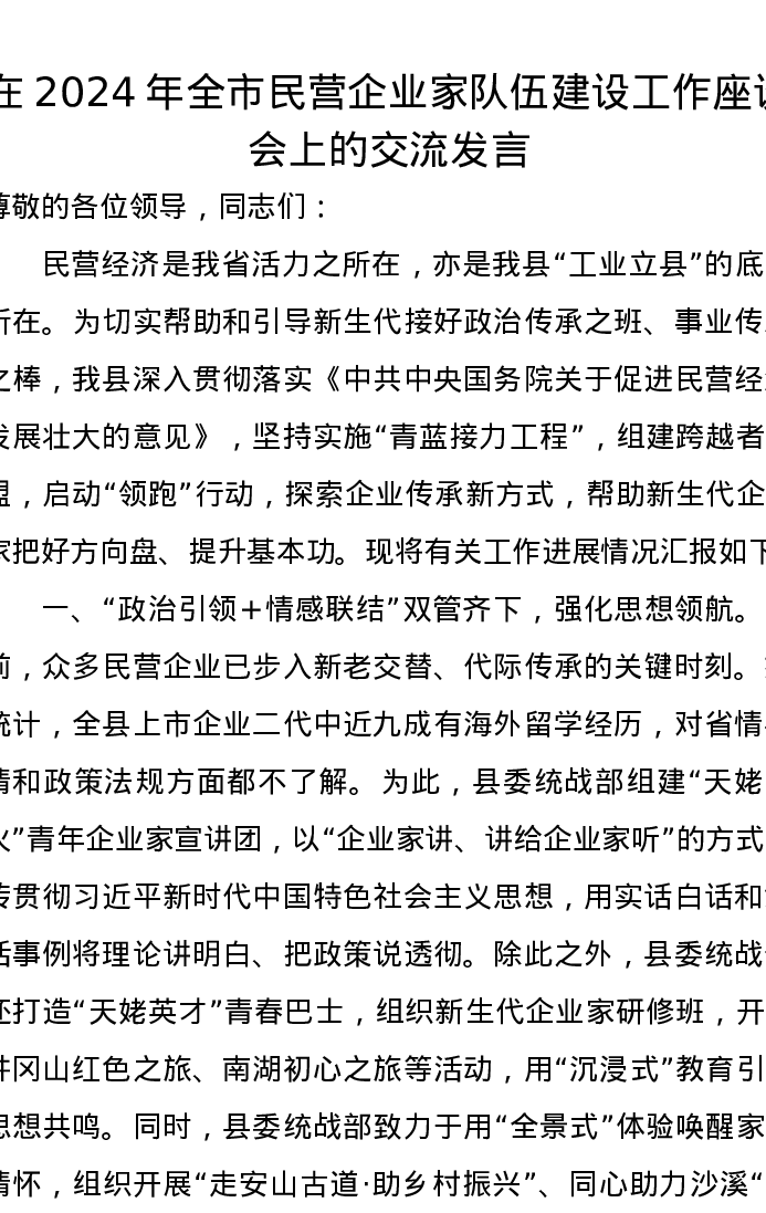 在2024年全市民营企业家队伍建设工作座谈会上的交流发言