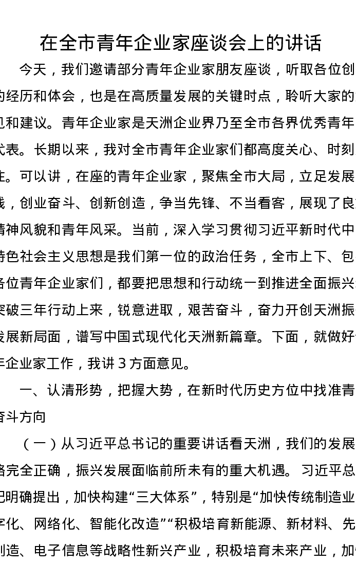 在全市青年企业家座谈会上的讲话