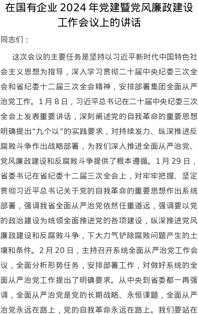 在国有企业2024年党建暨党风廉政建设工作会议上的讲话
