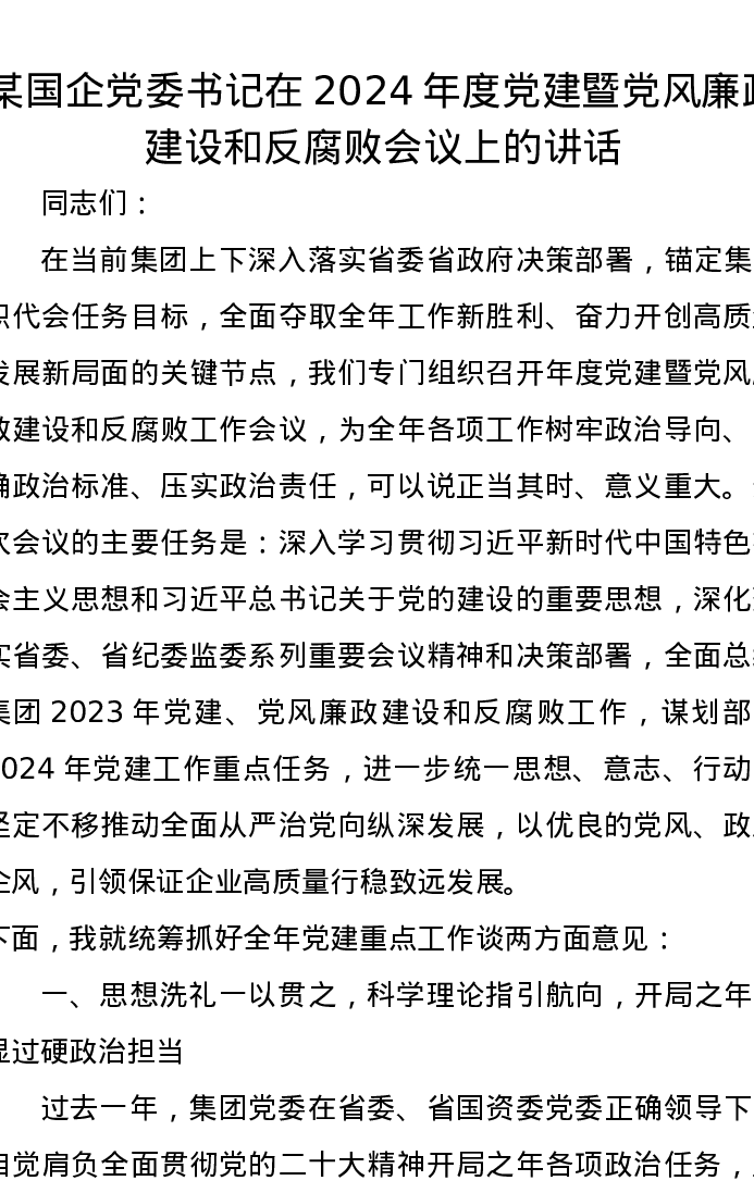 某国企党委书记在2024年度党建暨党风廉政建设和反腐败会议上的讲话