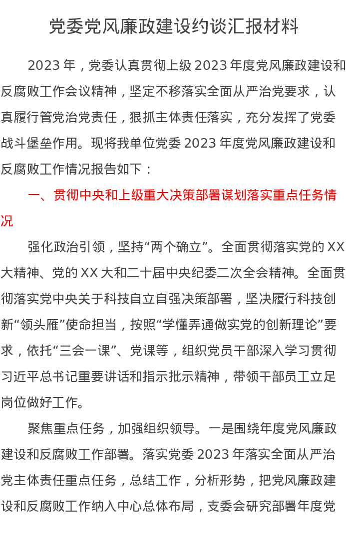 党委党风廉政建设约谈汇报材料