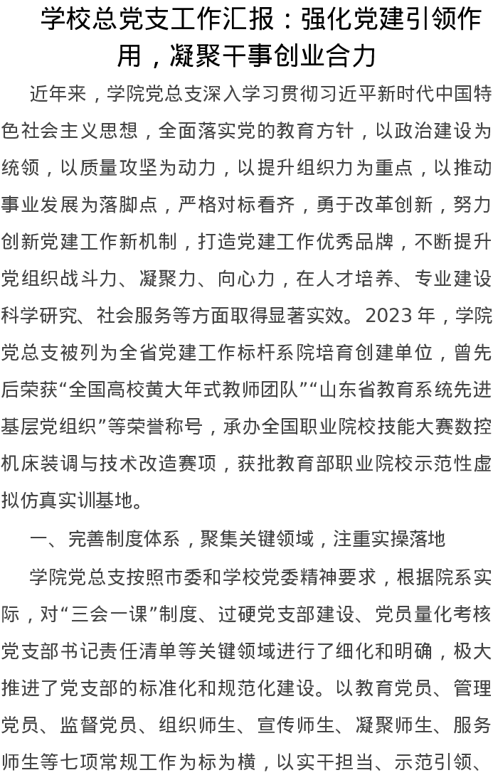 学校总党支工作汇报:强化党建引领作用,凝聚干事创业合力