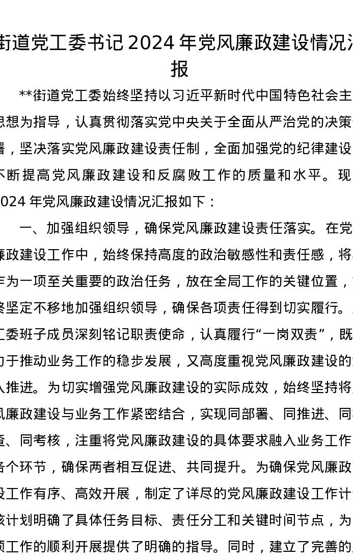 街道党工委书记2024年党风廉政建设情况汇报