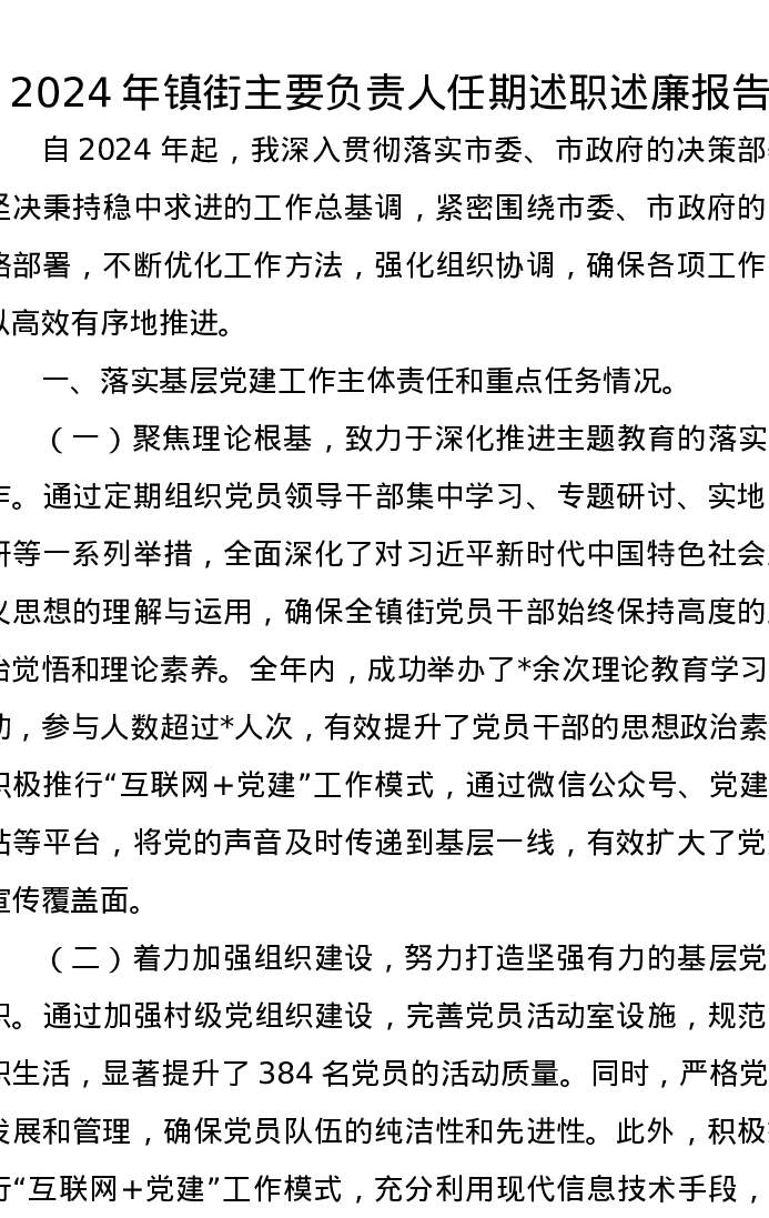 2024年镇街主要负责人任期述职述廉报告