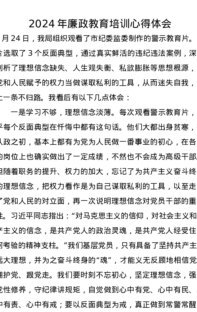 2024年廉政教育培训心得体会