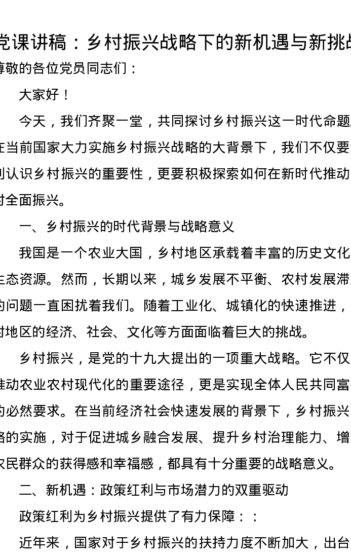 党课讲稿:乡村振兴战略下的新机遇与新挑战