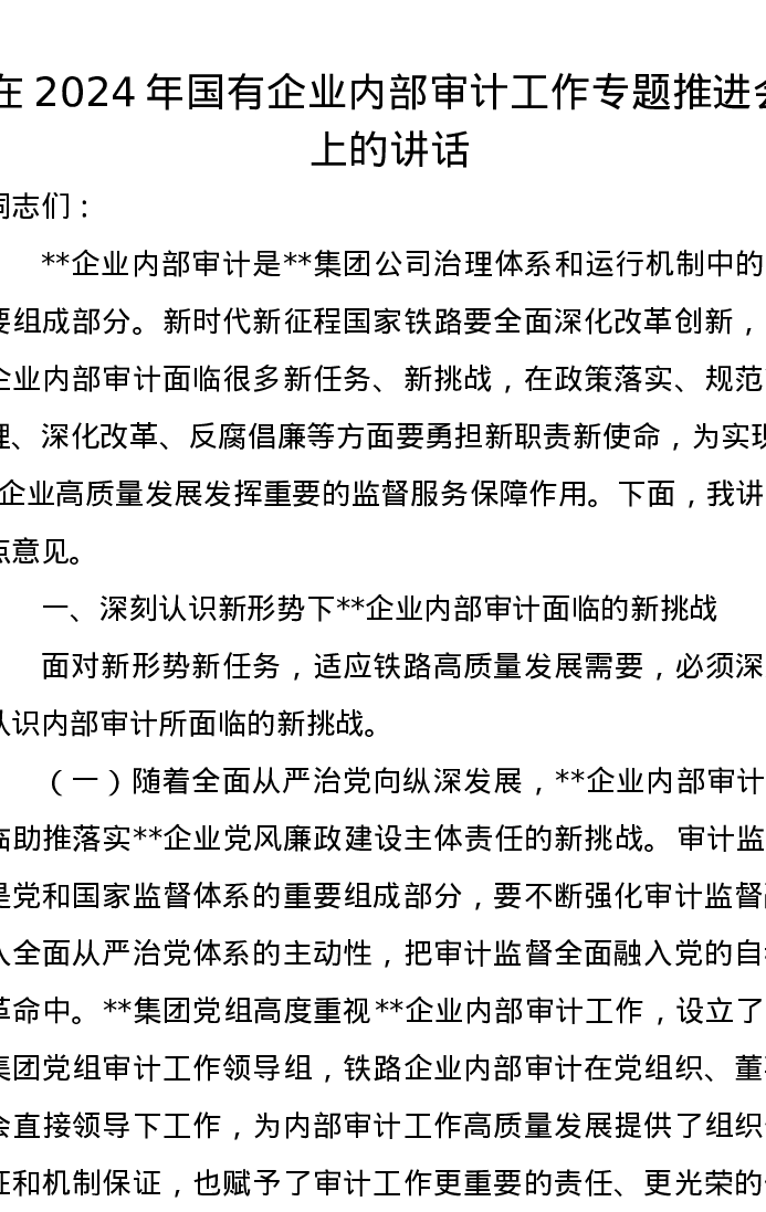 在2024年国有企业内部审计工作专题推进会上的讲话