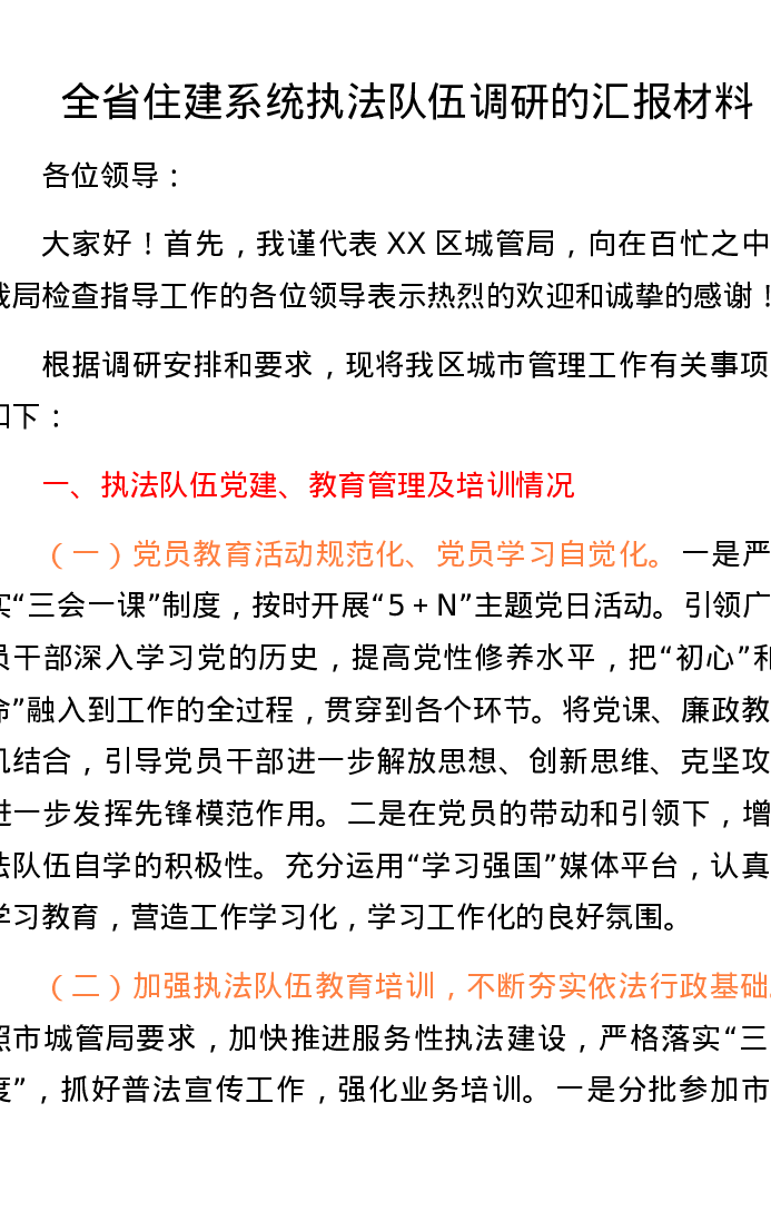 XX区全省住建系统执法队伍调研的汇报材料