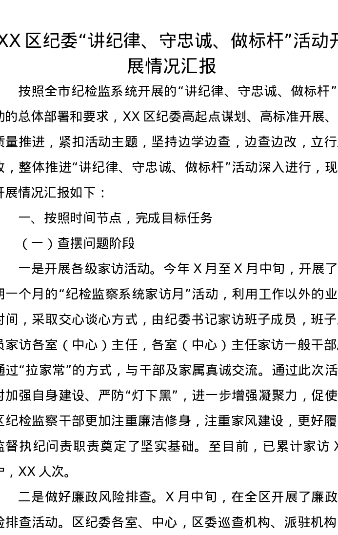 XX区纪委“讲纪律、守忠诚、做标杆”活动开展情况汇报