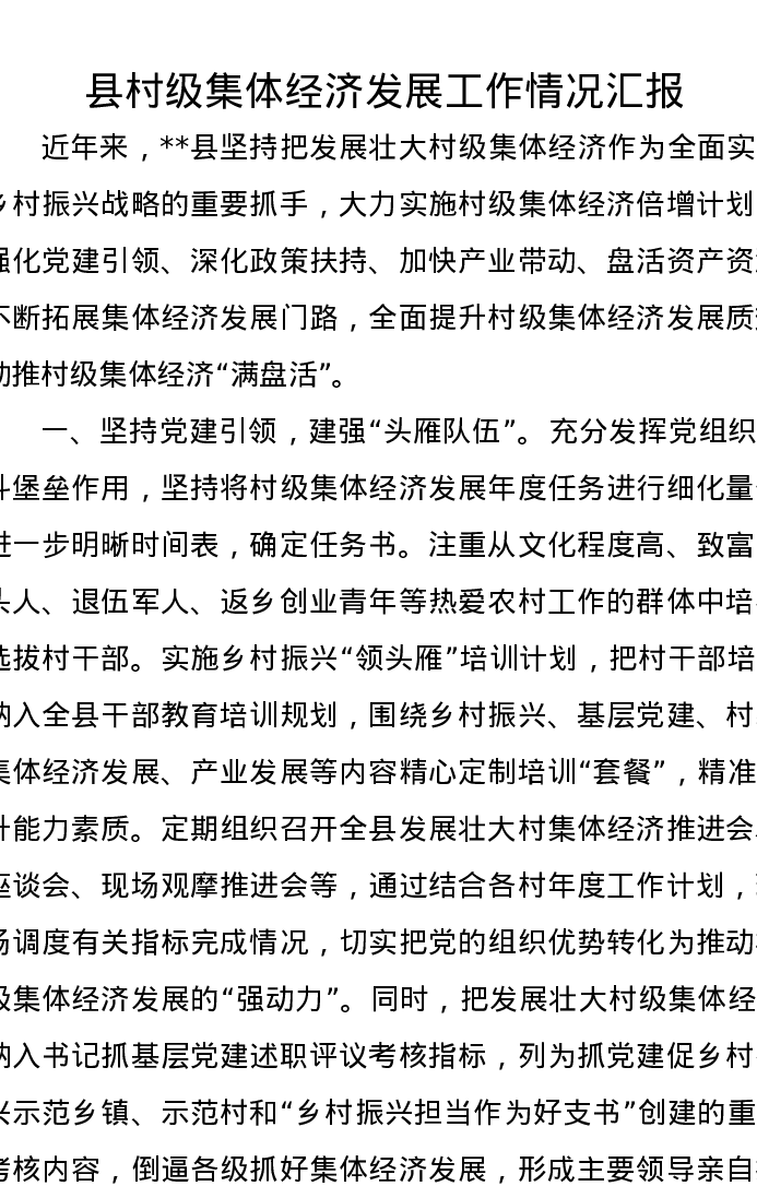 县村级集体经济发展工作情况汇报
