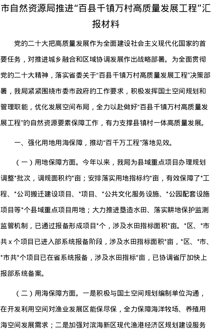 市自然资源局推进“百县千镇万村高质量发展工程”汇报材料