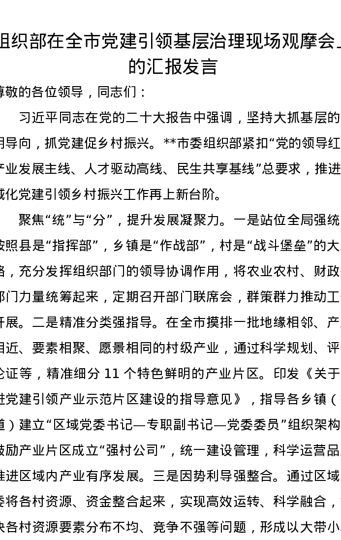 组织部在全市党建引领基层治理现场观摩会上的汇报发言