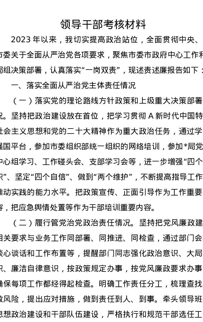 领导干部考核材料(述职述廉,落实从严治党、执行党的纪律情况)