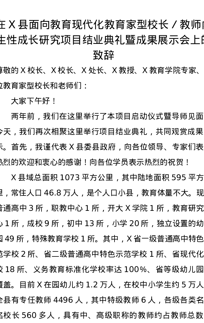 在X县面向教育现代化教育家型校长/教师内生性成长研究项目结业典礼暨成果展示会上的致辞