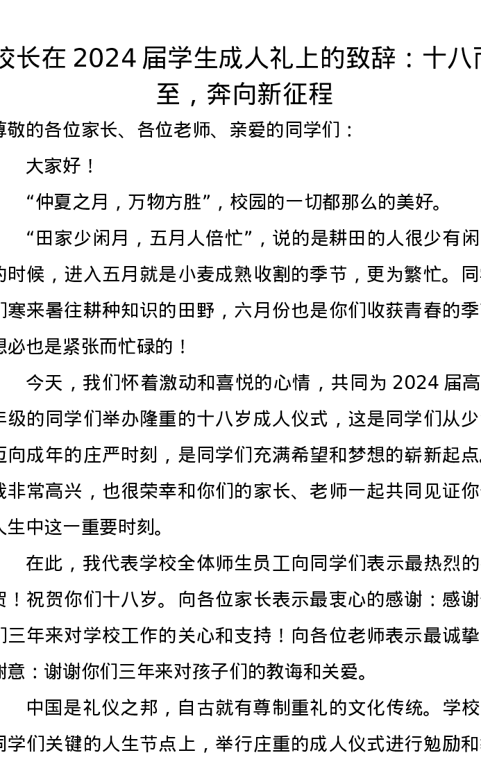 校长在2024届学生成人礼上的致辞:十八而至,奔向新征程