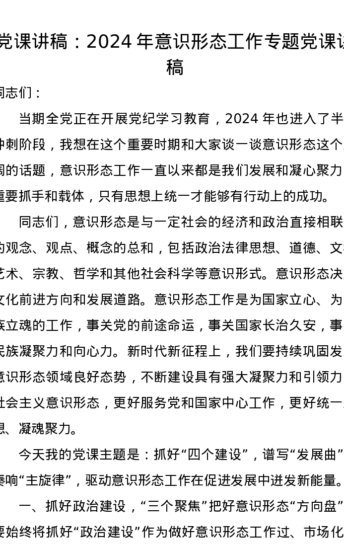 党课讲稿:2024年意识形态工作专题党课讲稿