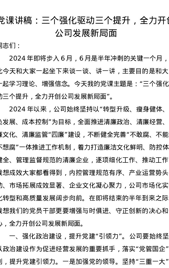 党课讲稿:三个强化驱动三个提升,全力开创公司发展新局面