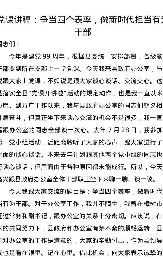 党课讲稿:争当四个表率,做新时代担当有为干部