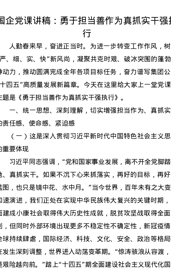 国企党课讲稿:勇于担当善作为真抓实干强执行