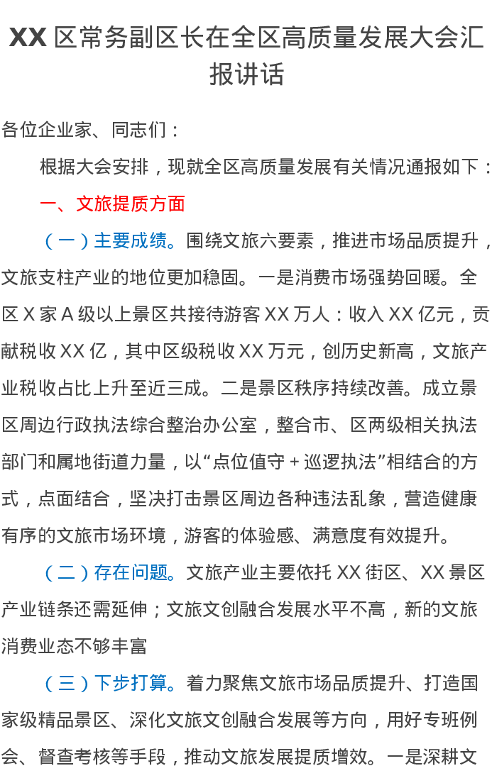 XX区常务副区长在全区高质量发展大会汇报讲话