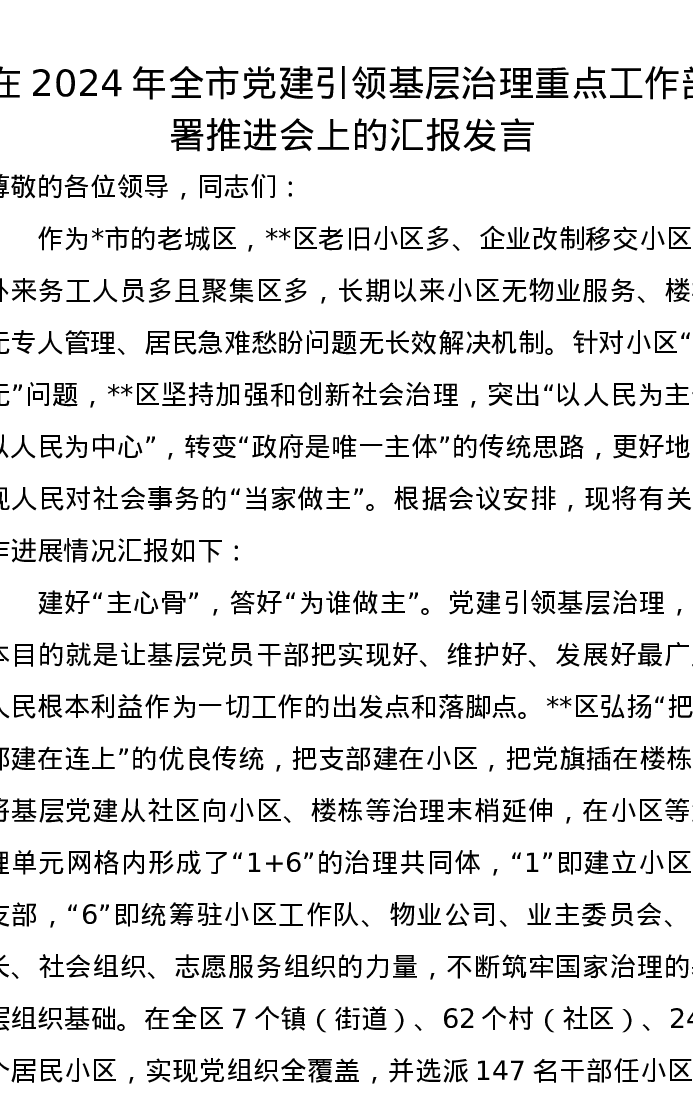 在2024年全市党建引领基层治理重点工作部署推进会上的汇报发言