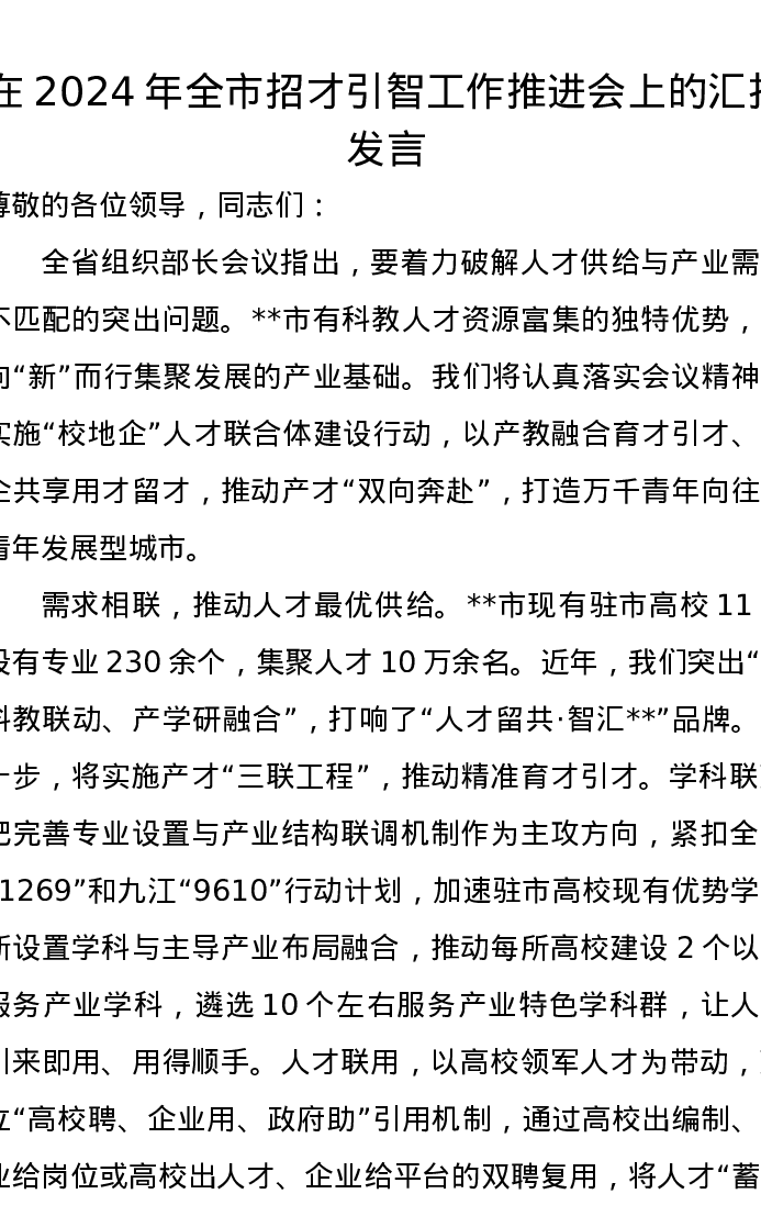 在2024年全市招才引智工作推进会上的汇报发言