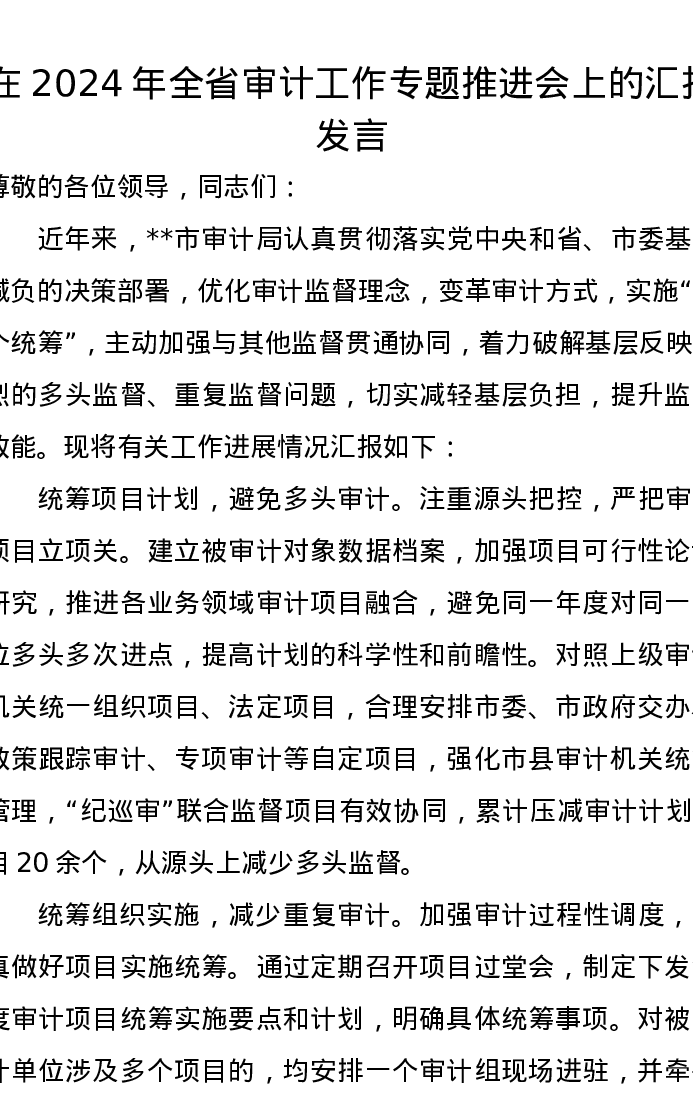 在2024年全省审计工作专题推进会上的汇报发言